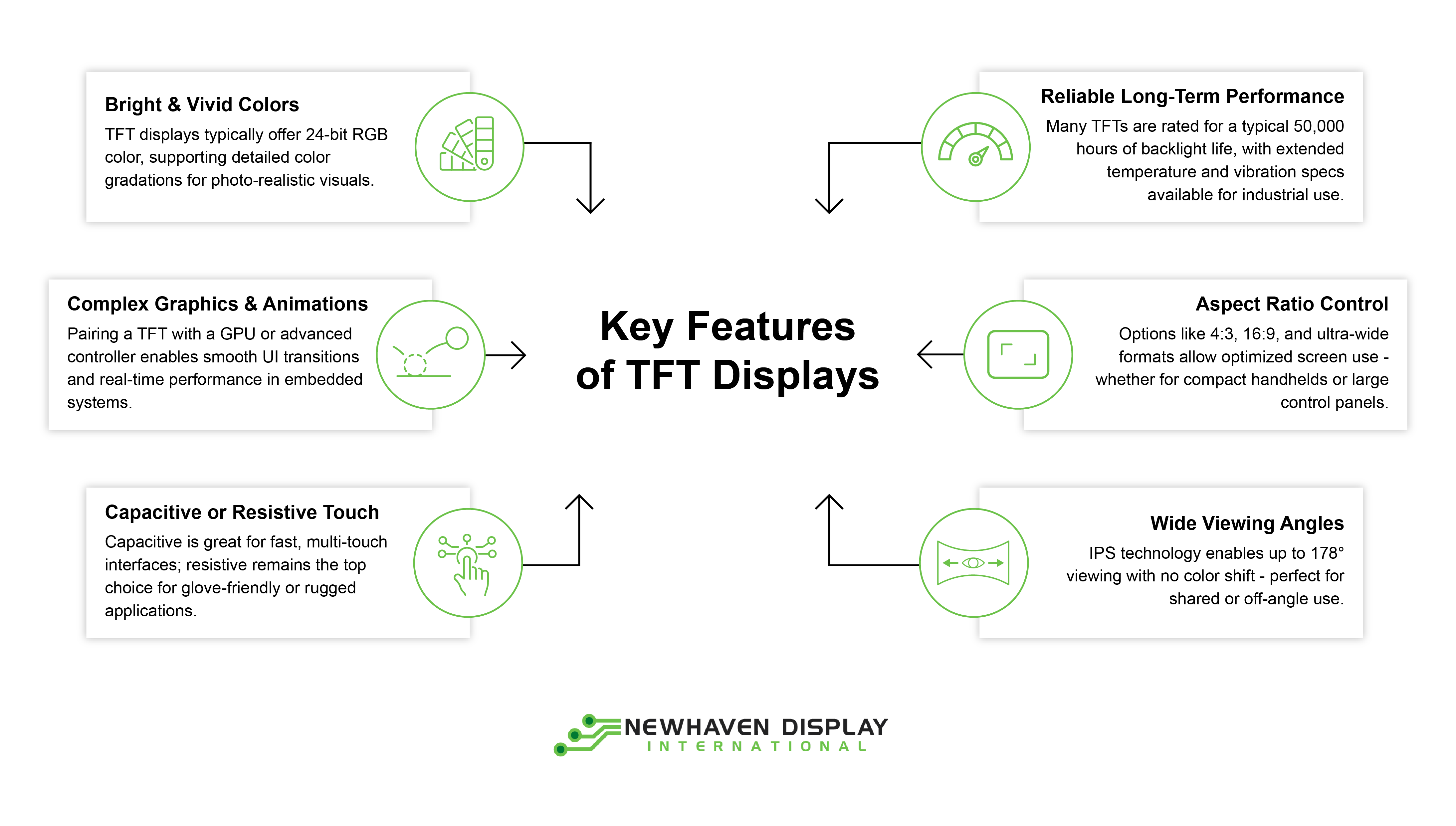 Wyświetlacze TFT zostały zaprojektowane z myślą o potrzebach nowoczesnych urządzeń elektronicznych. Oprócz ostrości obrazu i szybkiego działania oferują one funkcje, które pomagają produktom odnieść sukces w rzeczywistych warunkach.